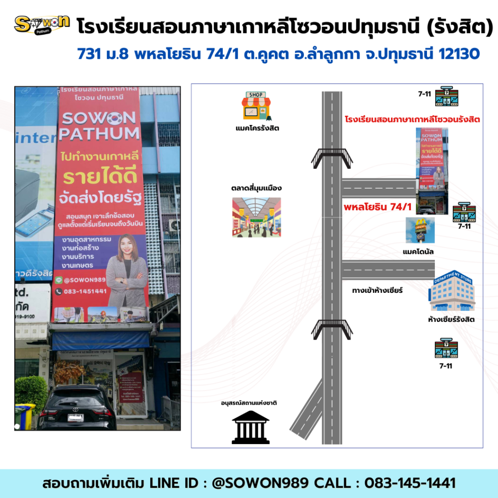 เรียนภาษาเกาหลีที่โซวอน ปทุมธานี (รังสิต) – ใกล้สนามบินดอนเมือง เดินทางง่าย ติดป้ายรถเมล์หน้าเซียร์ และติดถนนใหญ่ บรรยากาศดี! หาของกินสะดวก